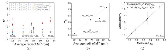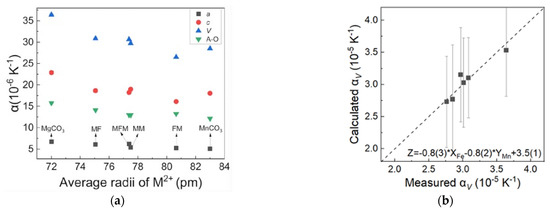 Figure 5. (a) Thermal expansion of MFM, MF, FM, MM, MgCO3, and MnCO3 with the change of the average ion radii. Data from Markgraf and Reeder, 1985, and Liang et al., 2020 [19,35]. (b) The equation of the relationship between the content of Fe2+ and Mn2+ and the thermal expansion αV with the change of the average ion radius of MFM, MF, FM, MM.