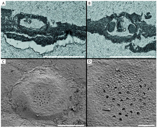 The conceptacles are tetrasporangial and have multiporate plates (Figure 3A–D), implying that the content of the sporangium (the capsule structure in which the reproductive spores are produced) divides to form four spores and that the roof of the sporangium has several openings. Contrary to the observations in Sciuto et al. [19], the pore plates are not flat topped with slightly raised rims, but dome shaped (Figure 3C). The conceptacle chambers are elliptical and develop within the dorsal region (Figure 3A–B). For the alga structure see Figure S3 in the supplementary information.