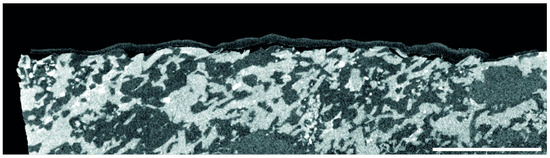 Reconstructed µCT image showing an attachment with an organic-rich and poorly calcified basal layer (dark), overlain by the strongly calcified main thallus (light) of T. antarcticum (crust thickness = ±100 µm) to its substrate. Scale bar = 1 mm.