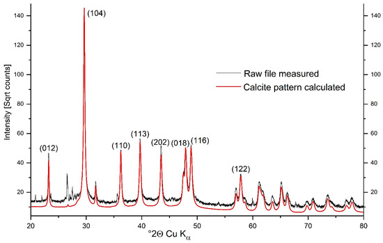 A representative diffractogram indicating the (hkl)-indices of the major calcite peaks is shown in Figure 6; the underlying spectra are provided in Figure S2.