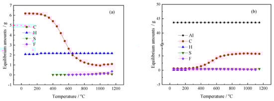 The FactSage calculation results showed that no liquid-phase products containing Al, C, H, S, or F were formed during the calcination and heating of the ceramsite raw materials. Figure 1 shows the variation trend in the gas-phase and solid-phase equilibrium products comprising Al, C, H, S, or F based on temperature, which did not change significantly upon increasing the temperature. Over the whole temperature range, only the solid-phase conversion of Al elements occurred, and no gas-phase products were generated; the generation of gas-phase equilibrium products comprising S and F was very low. When the temperature exceeded 1000 °C, the amount of F-containing gaseous pollutants increased slightly, but the S-containing gaseous pollutants decreased gradually, indicating that the high-temperature stage (>1000 °C) accelerated the volatilization of F in the ceramsite raw materials. However, the amount of C-containing gas-phase equilibrium products decreased gradually upon increasing the temperature, and the amount of corresponding solid-phase equilibrium products increased gradually upon increasing the temperature. This might be due to the gradual transformation of some C-containing gas-phase products into solid-phase products during the heating process.