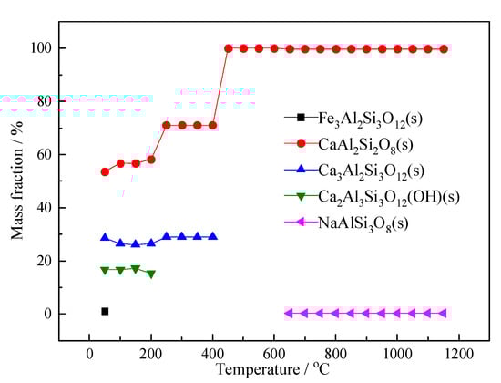 Figure 2 shows the distribution of Al in each phase during the firing of ceramsite. Al always existed in the solid phase during heating and calcination, and no Al-containing gas-phase product was found. Among them, Fe3Al2Si3O12 (almandite) existed only at 50 °C. Ca2Al3Si3O12(OH) (zoisite) and Ca3Al2Si3O12 (grossularite) disappeared at 250 °C and 450 °C, respectively. During the initial temperature increase stage (50–600 °C), the CaAl2Si2O8 (anorthite) content increased with an increase in temperature. When the temperature exceeded 650 °C, a small amount of CaAl2Si2O8 (0.26 wt%) was transformed into NaAlSi3O8 (albite).