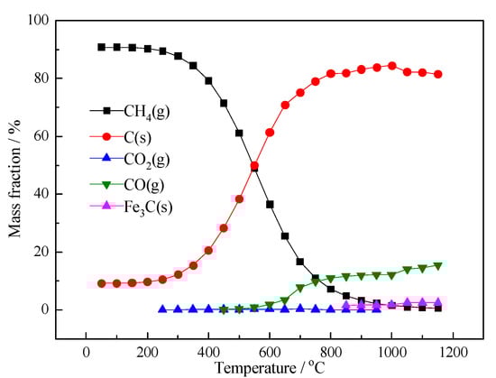 Figure 3 shows the forms of C in each phase of ceramsite during heating. Gaseous substances included CH4, CO2, and CO. The mass fractions of C and H2 (Figure 4) increased with the temperature, which showed that the migration and transformation of CH4 mainly occurred due to the cracking of methane [26] (Equation (1)).