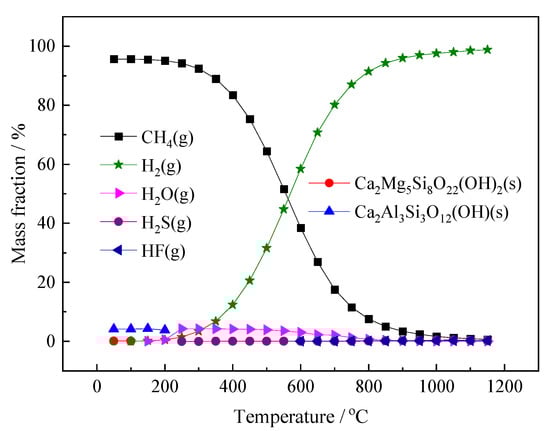 Figure 4 shows the distribution of H in each phase during the firing of ceramsite. Gaseous H-containing products included CH4, H2, H2O, H2S, and HF. Solid substances, which include Ca2Mg5Si8O22(OH)2 (tremolite) and Ca2Al3Si3O12(OH) (tanzanite), only formed at calcination temperatures below 200 °C, and their mass fractions remained unchanged. When the calcination temperature gradually increased, Ca2Mg5Si8O22(OH)2 and Ca2Al3Si3O12(OH) decomposed. The existence of CH4, H2, and H2O was discussed in the previous section.