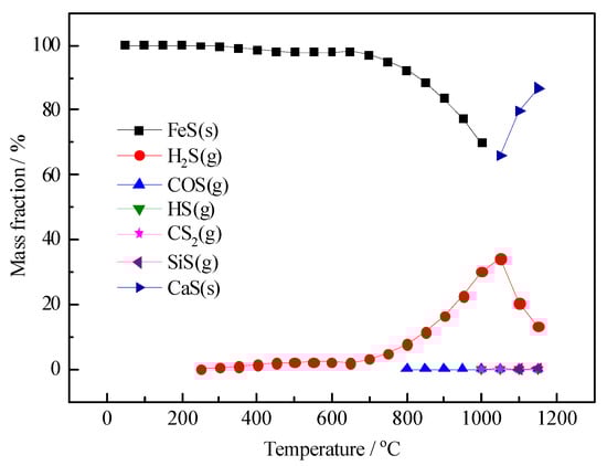 Figure 5 shows the distribution of S in each phase during the firing of ceramsite. When the temperature was in the range of 50–750 °C, only solid-phase FeS and gas-phase H2S existed in the system. The migration and transformation trends of FeS and H2S were consistent with the results discussed in the previous section.