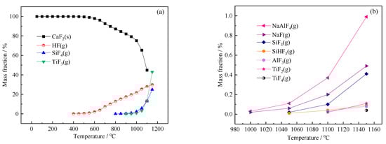 Gaseous TiF3 appeared at a calcination temperature of 900 °C, and its release increased with an increase in the calcination temperature. At 1150 °C, the mass fraction of TiF3 was 42.94 wt%, and it was produced by the reaction of HF with titanium oxides [37] (Equation (22)). As shown in Figure 6b, when the calcination temperature exceeded 1000 °C, various trace fluorine-containing gases began to appear in the system, including NaAlF4, NaF, SiF3, SiHF3, AlF3, TiF2, and TiF4 (Figure 6b). It was hypothesized that these gaseous fluorides were formed due to a series of reactions between HF and metal oxides, or high-temperature solid products in raw materials. Therefore, the actual production process could reduce the production of large amounts of gaseous fluoride by appropriately lowering the temperature.