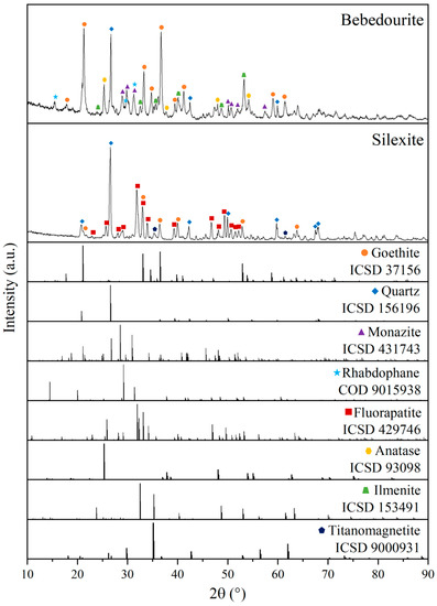 According to Soubiès [25], the weathering of fresh rock follows a sequence of transformations, which are: (i) perovskite into anatase, (ii) dissolution of apatite, replaced by secondary phosphates from the crandallite group, (iii) magnetite into iron oxyhydroxides, (iv) biotite kaolinization, and (v) total replacement/dissolution of pyroxene and olivine. BEDE is found in the isalterite/alloterite levels between the fresh rock and the soil horizons. This region is characterized by the predominance of iron oxyhydroxides, phosphates, minerals from supergenic alteration (e.g., anatase), and minor phyllosilicates (e.g., muscovite, biotite and phlogopite) [26]. Figure 1 shows the XRD diffraction patterns for the studied samples. The samples’ mineral composition was determined by Quantitative Evaluation of Minerals by Scanning Electron Microscopy (QEMSCAN) and shown in Figure 2. The consistency of mineral composition was checked with the chemical composition (Table 1) and XRD (Figure 1).