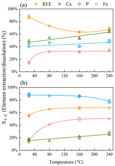 Figure 3 depicts the element extraction/dissolution for each sample at different temperatures, using the H2SO4:sample mass ratio of 0.45:1 and 30 min sulfation. For BEDE (Figure 3a), the lowest iron dissolution (14%—5.5 g L−1) and the highest REE extraction (87%—Ce + La = 4.1 g L−1, Nd + Pr = 1.5 g L−1) are observed at the lowest (25 °C) sulfation temperature. There is an increase in iron dissolution with temperature until a plateau at 33% iron extraction (10.3 g L−1 Fe) is reached at 80 °C. Conversely, REE extraction reaches a minimum at 160 °C (63% Ce + La = 3.1 g L−1, Nd + Pr = 1.2 g L−1). Calcium extraction increases whereas phosphorus is unaffected by the sulfation temperature and remains nearly constant. At 240 °C the maximum element dissolution reached 63% for Ca (0.5 g L−1) and 48% for P (1.7 g L−1).