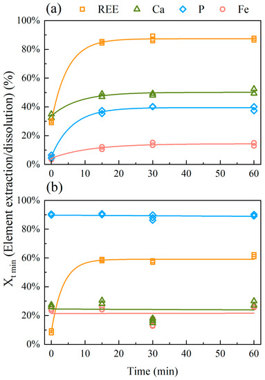 Figure 5 presents the results for different sulfation times with 0.45:1 H2SO4:solid (w/w) ratio at 25 °C for both samples. Demol et al. [29] reviewed the sulfuric acid bake processing and, overall, the residence times were reported in a range of 0.5–5 h. The reasons for this broad time range were not discussed, but one may assume that the degree of weathering, mineral carrier and REE content could play a fundamental role in the sulfation processing time.
