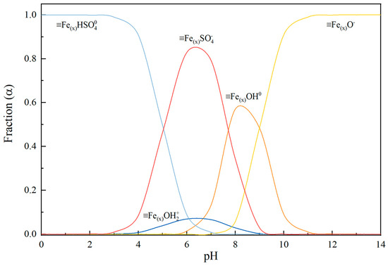 Schematic representation of the distribution of positive, negative, and neutral surface hydroxyl and sulfate groups on the goethite surface with a pKa1(int) = 6.7 and pKa2(int) = 9.0 [35], and logK1INT () = 12.81 and logK2INT () = 7.78 [34] at 25 °C. denotes a type-1 or type-2 surface hydroxyl group.