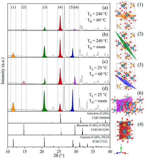 Comparative X-ray diffraction patterns for the SILX leach residues following sulfation at (a,b) 240 °C and (c,d) 25 °C. (a,c) the wet cake dried in an oven at 60 °C, and (b,d) at room temperature, both overnight. Gypsum planes: (1) (020) (orange), (3) (12-1) (green) and (5) (14-1) (blue); Bassanite planes: (2) (1-10) and (6) (400) (purple); and Anhydrite plane: (4) (200) (red). Blue spheres represent calcium, yellow spheres sulfur, red spheres oxygen and pink spheres hydrogen atoms). (TS = sulfation temperature, TD = drying temperature).