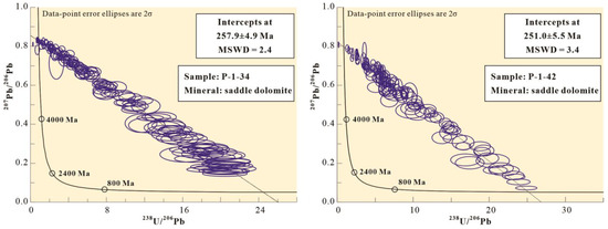 - Pan, L.; Hu, A.; Liang, F.; Jiang, L.; Hao, Y.; Feng, Y.; Shen, A.; Zhao, J. Diagenetic conditions and geodynamic setting of the middle Permian hydrothermal dolomites from southwest Sichuan Basin, SW China: Insights from in situ U–Pb carbonate geochronology and isotope geochemistry. Mar. Pet. Geol. 2021, 129, 105080. [Google Scholar] [CrossRef]