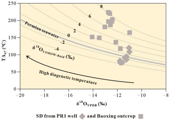 - Li, P.; Zou, H.; Hao, F.; Yu, X.; Wang, G.; Eiler, J.M. Using clumped isotopes to determine the origin of the Middle Permian Qixia Formation dolostone, NW Sichuan Basin, China. Mar. Pet. Geol. 2020, 122, 104660. [Google Scholar] [CrossRef]