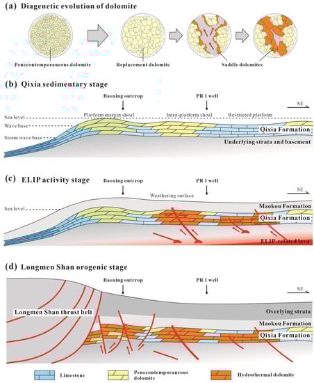 - ELIP activity stage (Figure 9c): The Emeishan mantle plume event in the Middle and Late Permian caused rapid differential uplift of the crust on the western margin of the Yangtze Plate, and the top of the Maokou Formation overlying the Qixia Formation was subjected to weathering and denudation [23]. At the same time, mantle plumes caused crustal stretching and extension, and the vicinity of deep and large active faults not only experienced abnormally high temperatures, but also provided a channel for marine fluids [42]. Because the PR1 well and its surrounding areas were in the intermediate zone of ELIP activity, this abnormal thermal event promoted the circulation of diagenetic fluids in the strata, and large-scale hydrothermal dolomitization occurred at shallow burial depths during the Late Permian. Saddle-shaped dolomite cement was deposited and filled in the dissolution holes and fractures of the zebra-like dolomite. However, because the Baoxing area was located at a larger distance from the ELIP activity, it was not significantly affected by this thermal event.