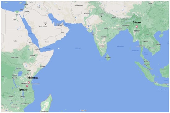Map of spinel locations in Tanzania and Myanmar (modified from Google Earth).