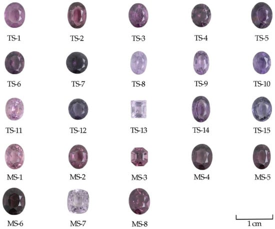 Geologically, gem-quality spinels from Asia and eastern Africa are recovered from various geological settings, mainly marble-hosted deposits. Famous sources of gem-quality purple spinels locate worldwide, including in East Africa (i.e., Madagascar and Tanzania) and Asia (i.e., Myanmar, Tajikistan, Sri Lanka, and Vietnam) []. Red spinel from Myanmar and cobalt blue spinel from Vietnam are particularly sought after in the gem marketplace and have been studied thoroughly in previous studies [,,,,,,]. However, there is little research on purple-violet spinel specifically. Until relatively recently with the new finding of attractive purple spinels in Afghanistan and new deposits in Vietnam [,,,], purple spinel was often marginalized commercially and has been gradually pursued by consumers.