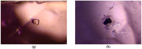 Microscopic observations revealed distinct internal characteristics in Tanzanian purple spinels. The fine dust-like exsolved particles are the most classical features, similar to the pink-red spinel from Tanzania. They scattered throughout the stone (Figure 4a) or were accompanied by negative crystals of octahedral or strongly distorted octahedral shapes of varying sizes (Figure 4b). Occasionally, the oriented long or short needles presented iridescence under fiber optic illumination (Figure 4c,d). As previously mentioned by Chankhantha (2021) and Schmetzer (1992) [,], these needles or particles were possibly caused by the exsolution of högbomite, giving samples a somewhat cloudy appearance. Since Tanzanian spinels formed in marbles, it was not surprising to find abundant carbonates as the most common mineral inclusions. Dolomite is often included in negative crystals aligned in a plane (Figure 4e) or presents a whitish, turbid, or ‘frosted’ aspect with black materials attached (Figure 4f,h). Closely related is the impurity in the marble-host rock, phlogopite [KMg3Si3AlO10(F; OH)2], which is present in spinels from nearly all the sources. Phlogopite is typically present as colorless, subhedral crystals (Figure 4g). Figure 4f reveals a colorless, subhedral olivine (forsterite) [Mg2SiO4] (Figure 4f) in one sample, which is extremely rare in spinel and was reported only once in Tanzanian spinel [].