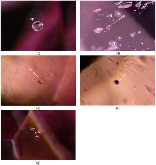 Inclusion scenes in purple spinels from Myanmar: (a) groups of euhedral apatite (Ap) (200×); (b) a single subhedral apatite (Ap) is associated with graphite (C) (80×); (c) isolated rounded apatite (80×); (d) several magnesite minerals included in negative crystals (200×); (e) a subhedral pyroxene (Px) was surrounded by some tiny colorless crystals (80×); (f) tiny colorless anhydrite (Anh) (80×); (g) reddish-brownish baddeleyite (Bdy) crystal associated with a tension crack (80×).