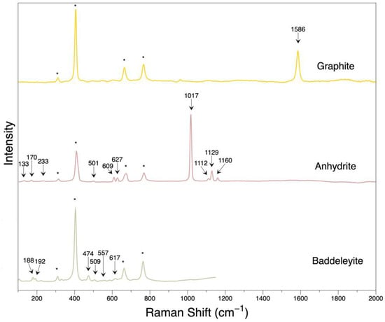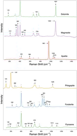 Raman spectroscopy allowed the identification of several mineral inclusions, and the representative Raman spectra are shown for these mineral inclusions analyzed in our samples, together with a spectrum of the host spinel in Figure 6.