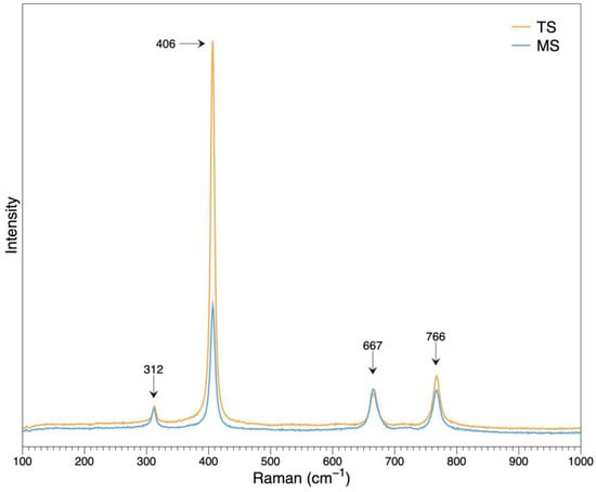 Raman spectra of spinels from Myanmar and Tanzania were collected in the spectral range of 100–2000 cm−1 (Figure 7). All the samples exhibit four intense and well-defined bands at around 312 cm−1, 406 cm−1, 665 cm−1, and 767 cm−1. These peaks are assigned to the T2g(1), Eg, T2g(2), and A1g mode []. The most prominent feature is the narrow line at about 406 cm−1.