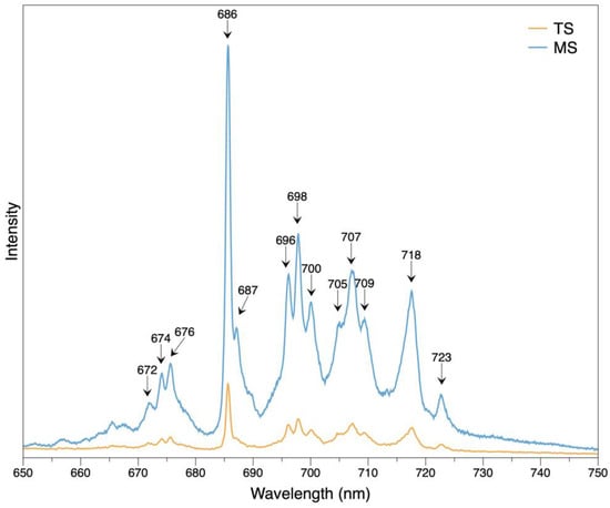 The PL spectrum of spinel is comprised of a strong zero phonon line at approximately 686 nm, vibronic sidebands of that line, and other lines associated with Cr3+ pairs. The sharp and defined chromium emission features verified that the stone was natural and unheated. Heat treatment typically broadens and shifts the position of PL peaks [,,].