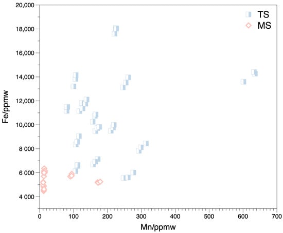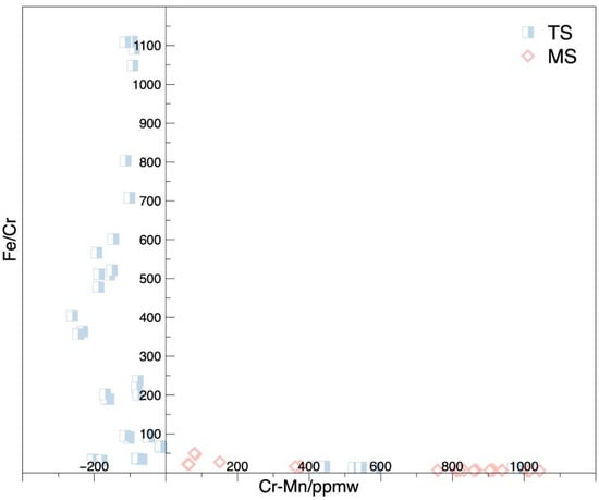 Red-pink spinels from Tanzania are enriched in Zn [], while the Zn values in purple-violet samples in this study are variable, ranging from 188 to 16424 ppmw. The most characteristic feature of Tanzanian spinels is their enrichment in Fe and Mn relative to Myanmar spinels (Figure 9). The Fe/V-Mn-Cr ternary diagram separates the two sources with only a small overlap (Figure 10). The Cr-Mn vs. Fe/Cr diagram shows that the majority of Tanzanian spinel sits in the Cr<Mn box with a higher Fe/Cr ratio from 10 to 1110; on the contrary, all the spinels from Myanmar sit in the Cr>Mn box with Fe/Cr ratio lower than 50 (Figure 11).