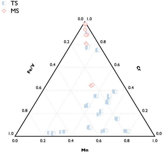 The Fe/V+Mn+Cr ternary diagram shows that the data clusters for the two spinel occurrences can be distinguished to a great extent.