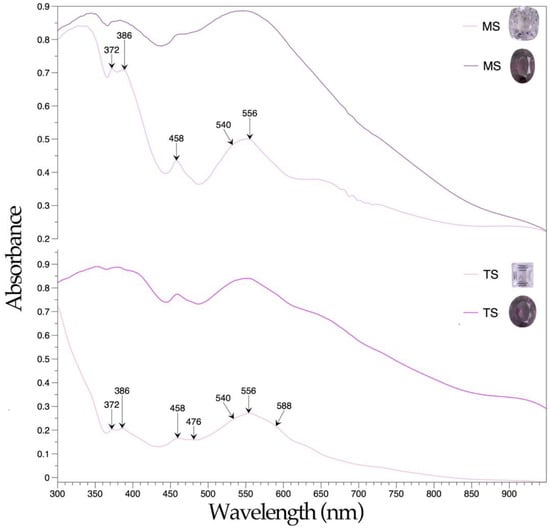 In addition, a strong Cr-related signature with a closely spaced group of fluorescent lines at around 700 nm was observed in MS samples. Fe, Cr, and V are the main chromophores of these stones, resulting in the purple color. Further, comparing the samples with different saturation, higher saturation stones showed stronger absorption and a rapid increase in absorption at wavelengths below 400 nm.