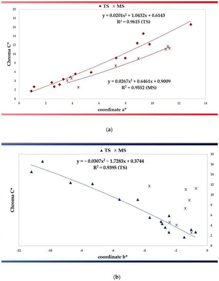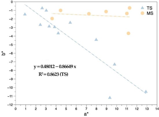 The color coordinate a* is inversely proportional to b* for TS samples, while a* barely depends on b* for MS samples.