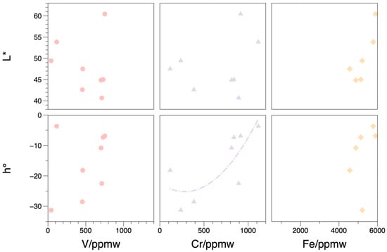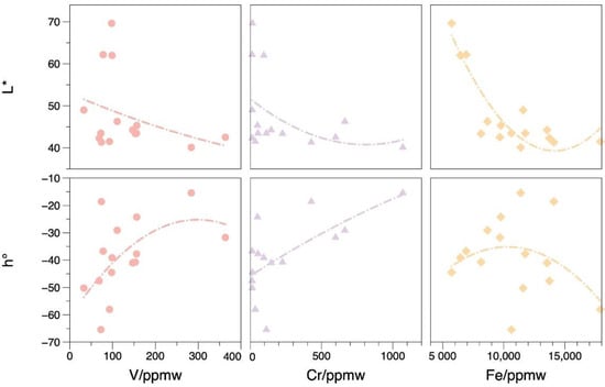Thus, the relationship between Cr/V/Fe contents and hue angle/lightness is analyzed. We focused on the Tanzanian samples first. There is a significant positive correlation between Cr/V contents and hue angle, while the relationship between Fe content and hue is the reverse (Figure 15). Moreover, the lightness lowers with the increase of these elements.