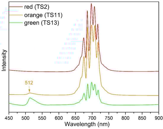 Most spinel samples in this study showed a red under long-wave UV excitation (365 nm). Of note were striking strong green and medium orange fluorescence in several Tanzanian samples. The green luminescence in spinel is attributed to tetrahedral Mn2+ [,,], while red fluorescence is related to the presence of Cr3+ [,]. Therefore, the spinel presents red fluorescence while Cr dominates and green fluorescence when Mn plays a leading role. When the impact of both elements is very similar, orange color, a mixture of red and green, appears. The representative fluorescence spectra with green, orange, and red luminescence were shown (Figure 17). An emission peak centered at about 512 nm is related to the presence of Mn. The green luminescence sample shows the strongest Mn-related peak, whereas the red fluorescence sample only displays a series of peaks around 700 nm. The orange luminescence sample shows a weak peak at ~512 nm and several strong peaks near 700 nm.