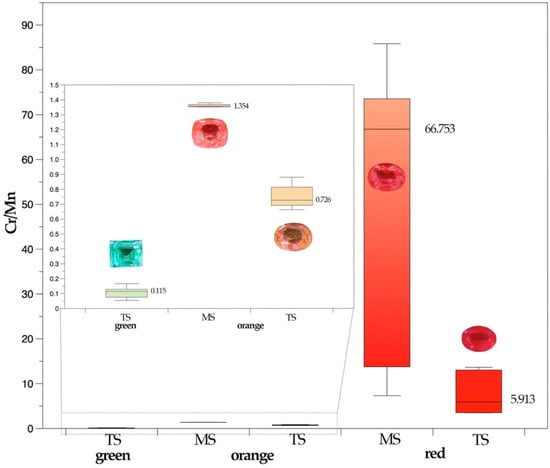 The relationship between Cr/Mn ratio and fluorescence with various colors. The values in the figure are the average value of each group. The values of the Cr/Mn ratio from high to low in order are red, orange, and green fluorescence. In addition, the Cr/Mn ratios of orange and red fluorescence are apparently higher in Myanmar samples.