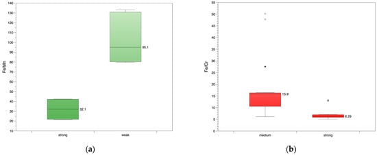 The FWHM of this sharp Cr3+ zero phonon line of the PL spectrum proves to be origin-dependent []. Similarly, we performed Lorentz fitting of this peak at ~686 nm and calculated the according FWHM values (Figure 20b). It is not surprising that the FWHM values for Myanmar samples are higher (0.839–1.067) than those for Tanzanian spinels (0.720–0.810) (Figure 21b), which is consistent with the Raman analysis.
