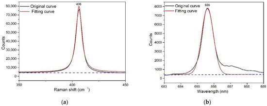 (a) The Lorentz fitting of the 406 cm−1 line of TS10. (b) The Lorentz fitting of the 686 nm line of TS10.