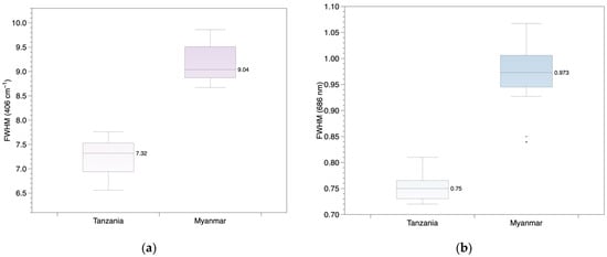 (a) The FWHM of the 406 cm−1 peak in the Raman spectrum in spinels from Tanzania and Myanmar. The values of the former are distinctly lower than those of the latter, with no overlapping. (b) The FWHM of the 686 nm peak in the PL spectrum in spinels from Tanzania and Myanmar.