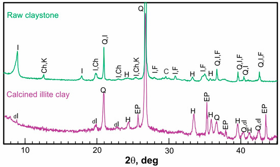 30]. The residence time was sufficient to cause the collapse of the illite crystalline structure and cooling at the kiln exit. Finally, the production was stacked in outdoor piles. During continuous production, samples of calcined clay were taken to control the process using XRD and to measure the intensity of the illite reflections at 2θ = 8.82° and 19.82°. Finally, the calcined illite clay was characterized by its chemical and mineralogical composition (