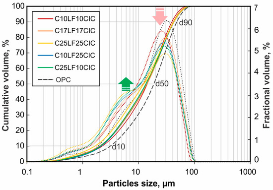Figure 2) with a predominant mode (24–27 μm), the fractional volume of which is reduced and, with fine particles increased (3–7 μm) with increasing SCM content. For multicomponent cements, grinding results depend on the grindability and volume of each component. For this system, clinker is the hardest component, causing the clinker fraction to occupy the large particles and defining the size rejection in the separator. The higher grindability of the SCM fraction produces an increase in finer particles in the fractional volume (