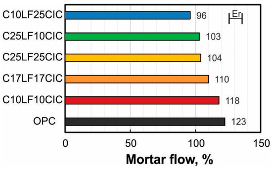 The mortar flow was assessed using the flow table (ASTM C1437) in the RILEM mortar (sand: binder = 3; w/b = 0.50) containing standard siliceous sand. Mortar compressive strength was evaluated on 40 × 40 × 160 mm3 prims. The reported value is the average of six tests.