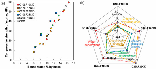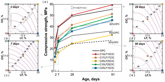 Figure 4d,e) become parallel to the x-axis for LF < 12.5%, and the CS decreases when the LF or CIC increases. After 90 days, the three CPCs with 35% SCM achieve a compressive strength greater than 45 MPa for all combinations. Compared with OPC, CPCs with 35% SCM have a relative CS between 0.83 and 0.93.