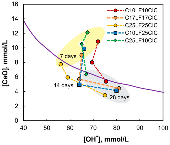 Figure 5. For CPCs with 10% CIC, the pozzolanicity is positive after 28 days (the points are slightly below the solubility curve), and the increase in LF increases [CaO] and decreases the [OH
