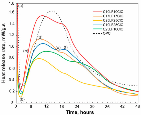 53]. The CPCs show a decrease in the heat rate when the SCM replacement increases, and there are no significant changes in the time of characteristic peaks in the curve. Hence, the curve with a high heat rate corresponds to a replacement of 20% SCM (C10LF10CIC), and that with a low heat rate corresponds to 50% SCM (C25LF25CIC). CPCs with 35% SCM (C10LF25A, C17F17A, and C25F10A) show an intermediate rate of heat release. The first minimum occurs between 100 and 130 min, and the intensity decreases from 0.28 to 0.11 mW/g from low (C10LF10CIC) to high replacement (C25LF25CIC). Additionally, the dormant period is extended.