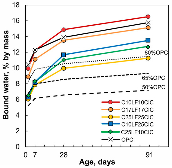 Figure 7 shows the percentage of Wn for CPCs and OPC. Dotted and dashed lines correspond to 80, 65, and 50% of Wn of the OPC. With an increase in LF + CIC from 20% to 50%, the Wn decreases due to the dilution effect. However, the observed percentage of CPCs is higher than that of clinker content (dotted and dashed lines). Wn increases up to 28 days and is then approximately constant, indicating that hydration of CIC from 28 to 90 days does not significantly increases Wn. For CPC with 35% SCM, the Wn of C25LF10CIC and C10LF25CIC shows different behavior than that of C17LF17CIC.