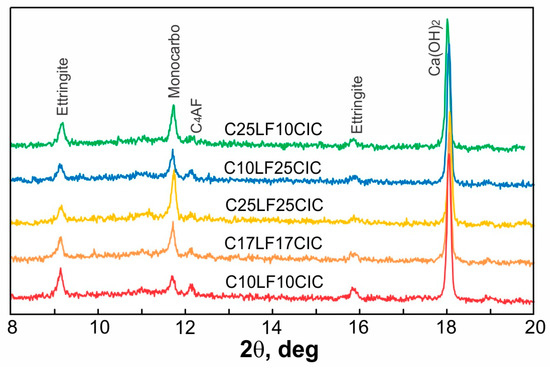Figure 8) are clearly detected. For CPC with increasing SCM content, the intensity of ettringite decreases, and the intensity of the monocarboaluminate peak increases, while the Ca(OH)