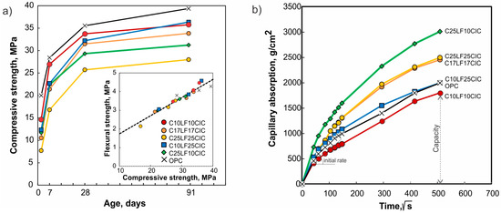 Figure 10a). The CPC strength class can be classified as 42.5 when the CIC + LF replacement is limited to 35% and 32.5 for higher replacements. Considering the compressive strength after 90 days, the progress of the pozzolanic reaction of CIC allows for an increase in the SCM replacement for a given strength class with the precaution of limiting the LF content.