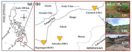 Various locations of the three raw silicates located in (a) Mindanao, Philippines. (b) The three municipalities where the raw materials are sourced on the island of Mindanao (source: Google Maps). (c) Actual sites (images) of the raw materials: LRC in Linamon, SBC in Salvador and KDE in Kapatagan.
