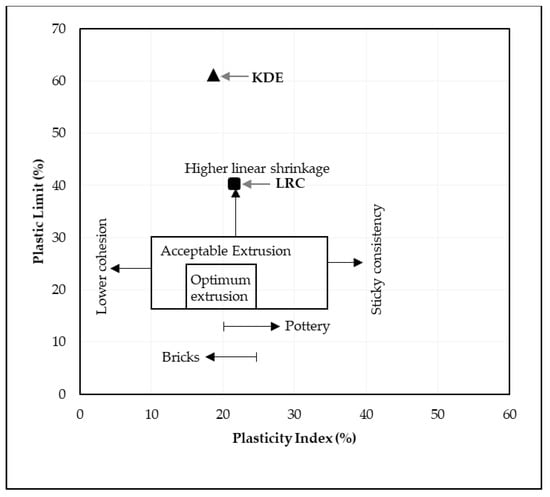 The liquid limit, plastic limit and plasticity index of the powders of the three raw materials after being passed through a 425-micron sieve were investigated. The Atterberg limits of LRC shows a liquid limit of 62% and a plastic limit of 40%, which resulted in a plasticity index of 22%. SBC is reported to be nonplastic in accordance with ASTM D4318-10 [13] since neither the liquid limit nor the plastic limit could be determined. Adding more water to form the plastic mass still resulted in the crumbling of the samples as shown in Figure 3. The Atterberg limits of the KDE shows a liquid limit of 79% and a plastic limit of 61%, which resulted in a plasticity index of 18%. Accordingly, clays that present a plasticity index between 20% and 35% are denominated high plasticity clays and those with plasticity index values between 10% and 20% are denominated medium plasticity clays. Following these criteria, LRC can be classified as high plasticity clay, coinciding with the appearance of smectites, as presented in the XRD results where samples relatively high in smectite and illite are the most plastic [23] while KDE is classified as a medium plasticity clay. Figure 4 shows a plot of the plasticity of LRC and KDE. Both LRC and KDE were categorized as elastic silt in accordance with ASTM D2487 [24], meaning that elastic silt has a liquid limit of 50 or greater. LRC exhibited a lower liquid limit and plastic limit than previous studies [5] on nickel laterite mine waste (NMW) and expansive soils [25,26]. Furthermore, Figure 5 shows an extrusion prognostic using the plasticity of the samples studied by the Atterberg limits [27]. The plastic limit is related to the amount of moisture required for clay to reach a consistency that makes the extrusion process possible while the plasticity index falls between a plastic and sludge consistency range [27]. The plasticity index must be more than 10% for the clays to be utilized in the production of bricks via an extrusion process [27,28]. In this study, both LRC and KDE have a plasticity index higher than 10%. However, it can be observed that both LRC and KDE are located outside the limits of the acceptable extrusion region, indicating that these samples will result in higher linear shrinkage, which is prone to cause problems when forming products. This property may be improved via the addition of nonplastic materials such as feldspar and silica for usability in the ceramic industry. Figure 5 shows that both LRC and KDE are suitable for brick production using plastic mass forming or hand wedging [27,29]. LRC is likely acceptable only for pottery production [27]. The unique Atterberg limit values of the three raw materials could be attributed to their varying population of fine particle sizes, particularly in the fraction of particles with diameters of less than 2 microns, which is the most important driver of clay mineral flexibility [30]. In addition to the fine fraction of particles, the quantity and type of clay minerals, as well as the type of absorbed cations [31], may also affect the Atterberg limit values.