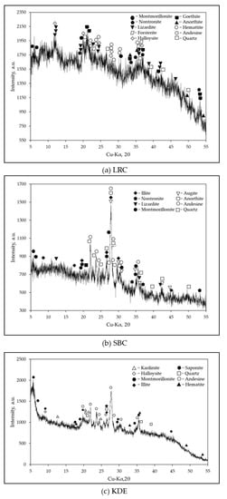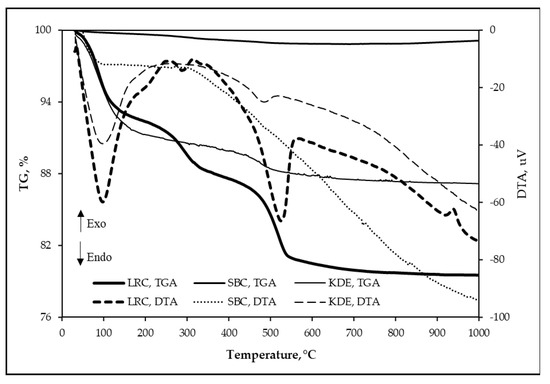 The DTA curves and mass losses obtained from the thermogravimetric analysis of each raw material are shown in Figure 8. It can be seen that the total mass loss of LRC, SBC and KDE are 20.49%, 0.88% and 12.84%, respectively. The DTA curves of the raw materials lead to the following results: significant endothermic peak at 97.62 °C for LRC, 110 °C for SBC and 97.27 °C for KDE, which can be attributed to the elimination of free water on the particle surfaces of the raw materials [19,21,41,46,49]. An endothermic band centered at ~287.67 °C is observed only in LRC, which is due to the pre-dehydration of clay minerals [21]. In addition, an endothermic peak at 525.37 °C for LRC and ~485.12 °C for KDE is due to clay minerals’ dehydroxylation causing the structure of clay minerals to collapse [19,21,41,46,49]. The exothermic peak at ~937.72 °C for LRC is attributed to the decomposition of montmorillonite and formation of defects, aluminum-silicon spinel (Si3Al4O12) structures (structural re-organization) and some amorphous phases [50,51,52]. Here, the iron ions caused the diffusion and breakage of the clay structure [53,54]. Furthermore, the various phases of decomposition that were supposed to be contributed by the suspected carbonates such as calcite [55,56], siderite [57], ankerite [57], huntite [58], dolomite [59,60] and rhodochrosite [61] are not evident in any of the three samples. This further means that the endothermic reaction around 525.34 °C in LRC in particular is only attributed to the dehydroxylation of clay minerals [19,21,41,46,49].