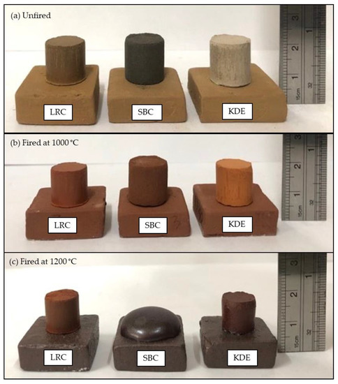 Images of the pellets of LRC, SBC and KDE before and after firing are shown in Figure 9, and the color of these samples were evaluated using the Munsell soil color chart [62] as seen in Table 3. The unfired pellet of LRC has a brownish yellow color, while the color of SBC is black and that of KDE is light brown. After firing, pellets of the three samples exhibited various shades of red. This is mainly due to the presence of iron oxide, where content greater than 4% (Fe2O3 plus TiO2) gives an increasingly red coloration [19,48]. SBC is found to be the darkest shade of red, followed by LRC and KDE. We noted that the Fe2O3/TiO2 ratio increases in this order, with SBC having a 2.8789 value and LRC and KDE having values of 6.5616 and 7.800, respectively. The samples exhibited a non-metallic luster after firing at 1000 °C. The results of the color of the raw materials fired at 1000 °C could predict the desired fired color for terracotta and earthenware ceramicware applications. The pellets of LRC, SBC and KDE fired at 1000 °C were not fused on flat tiles, as shown in Figure 8b.