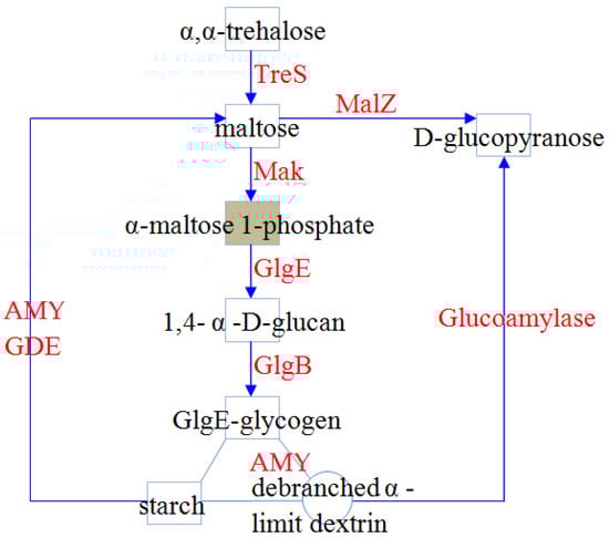 This enzyme is multifunctional. It contains an α-amylase catalytic domain (Amy) and a trehalose synthase-fused maltokinase domain (TreS-Mak), as in the case of the enzymes found in other bacterial phyla [43]. In this fused domain, the function of the trehalose synthase (TreS) is to interconvert maltose and trehalose. In turn, the maltokinase domain (Mak) catalyzes the second step of glycogen synthesis: maltose conversion into maltose 1-phosphate.