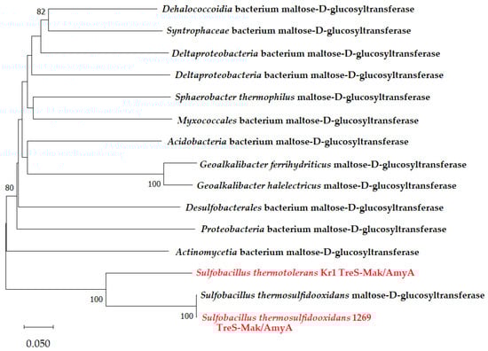 Phylogenetic position of Sulfobacillus α-amylase/trehalose synthase. The phylogenetic tree was constructed using MEGA 11 [35]. The evolutionary history was inferred using the neighbor-joining method [39]. The optimal tree is shown. The percentage of replicate trees in which the associated taxa clustered together in the bootstrap test (1000 replicates) are shown next to the branches (values lower than 80% are hidden) [40]. The tree is drawn to scale, with branch lengths in the same units as those of the evolutionary distances used to infer the phylogenetic tree. The evolutionary distances were computed using the Poisson correction method [41] and are in the units of the number of amino acid substitutions per site. This analysis involved 15 amino acid sequences. All ambiguous positions were removed. There were a total of 1125 positions in the final dataset.